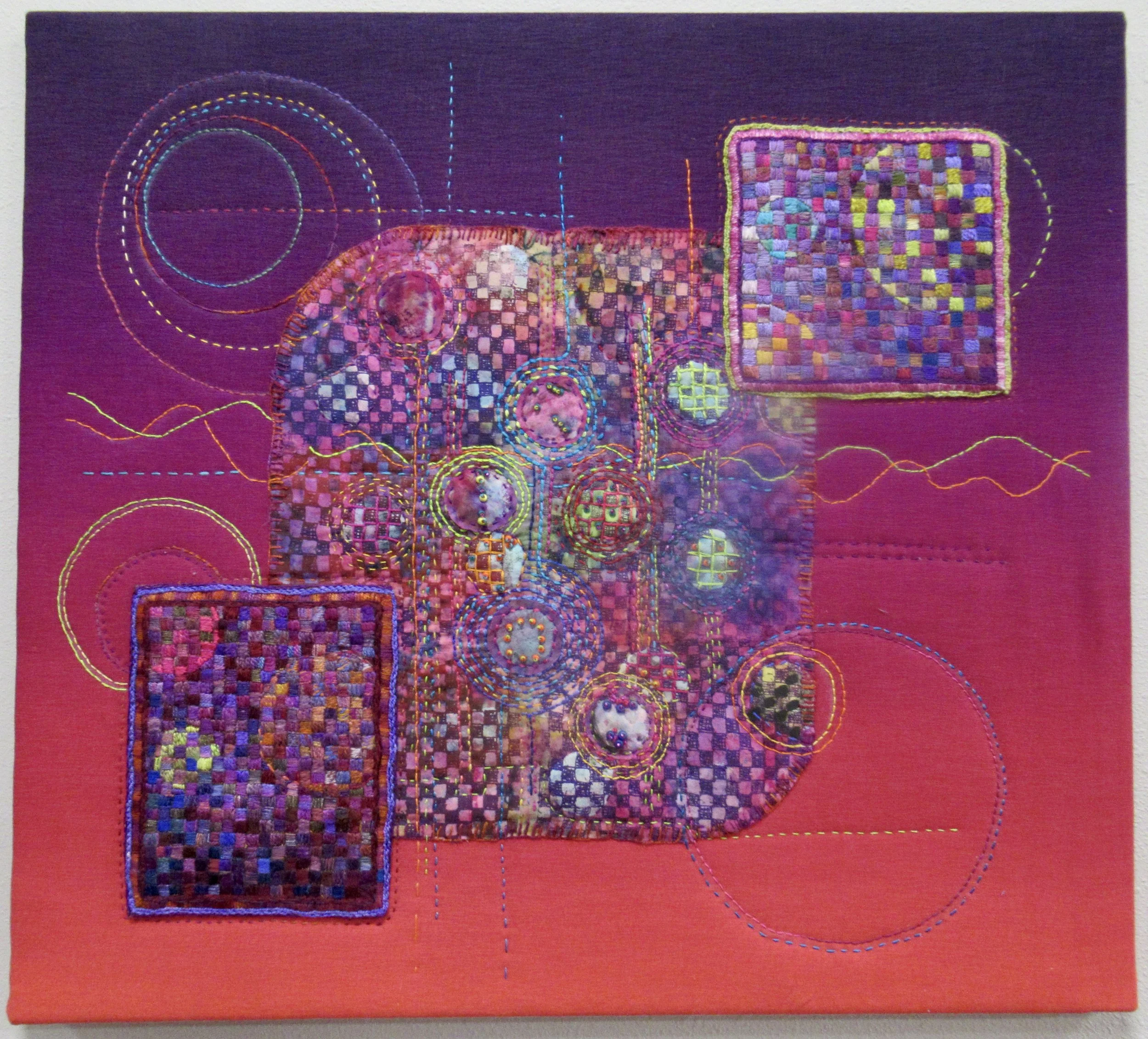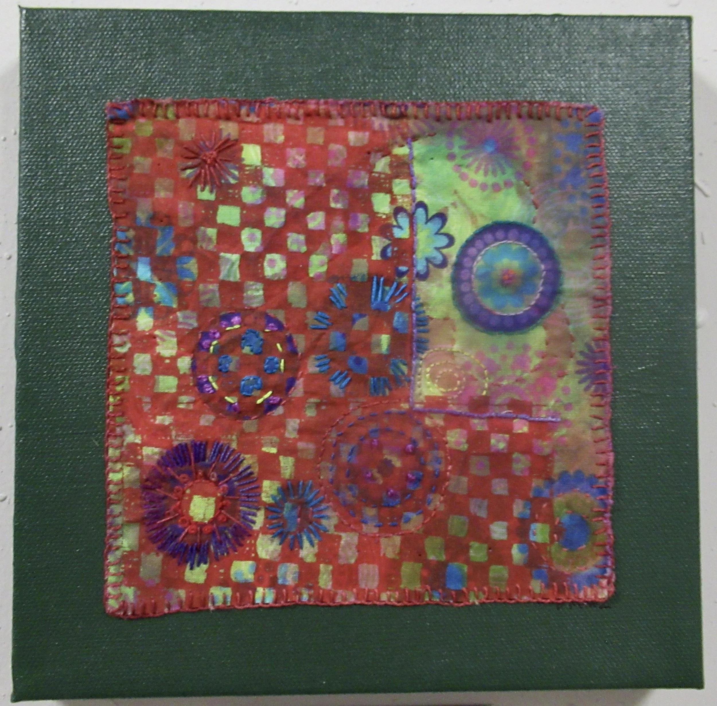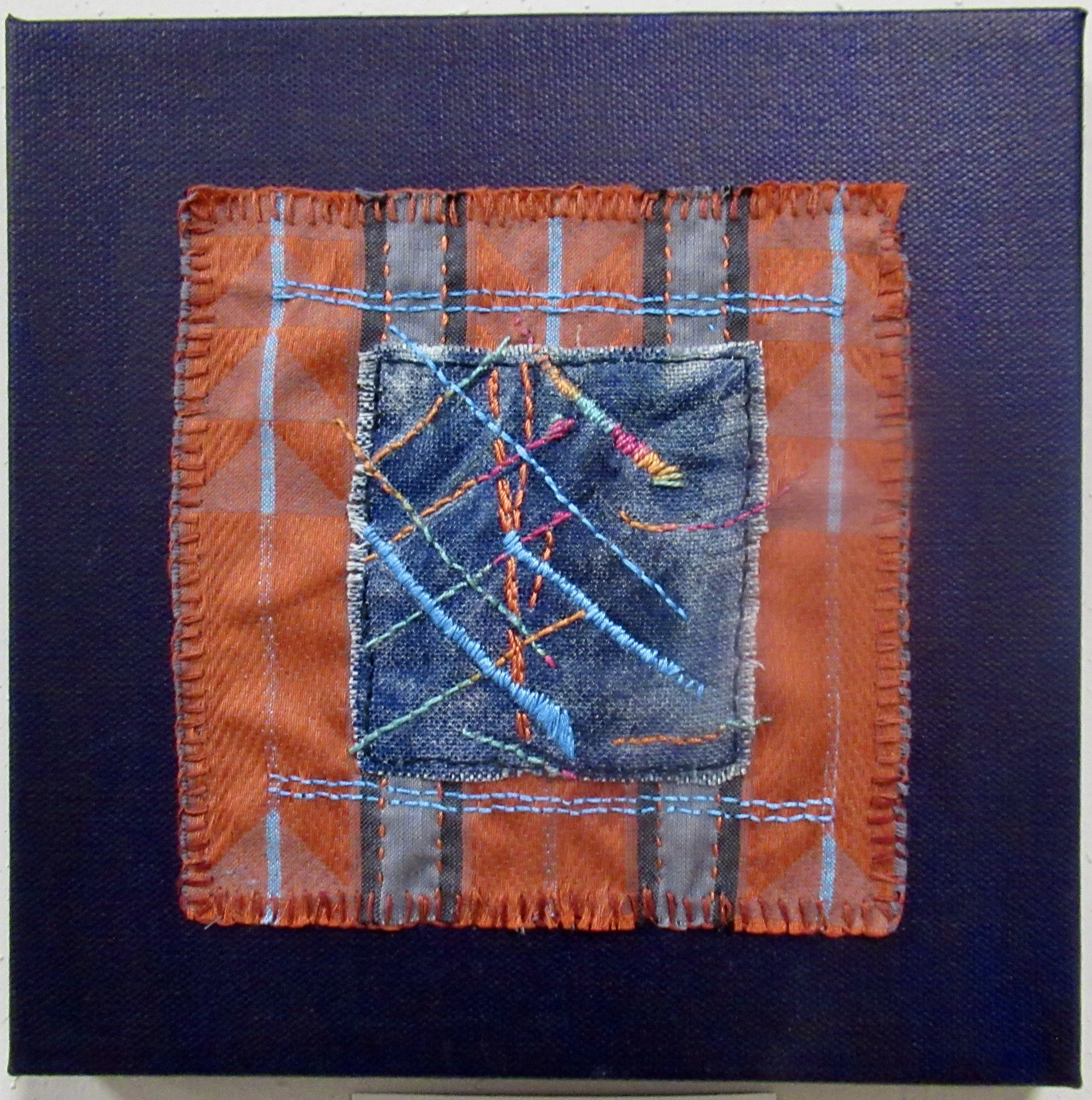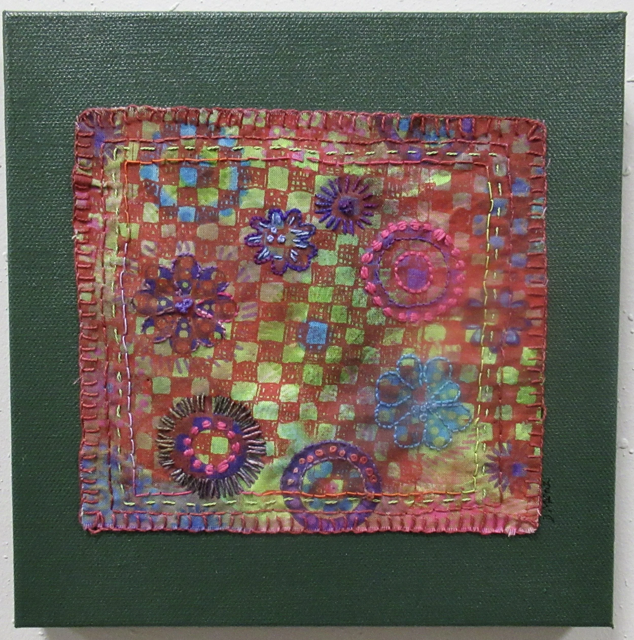 It started out as a disciplined squares embroidery with squares in a line, but the squares had a mind of their own and this piece resulted.