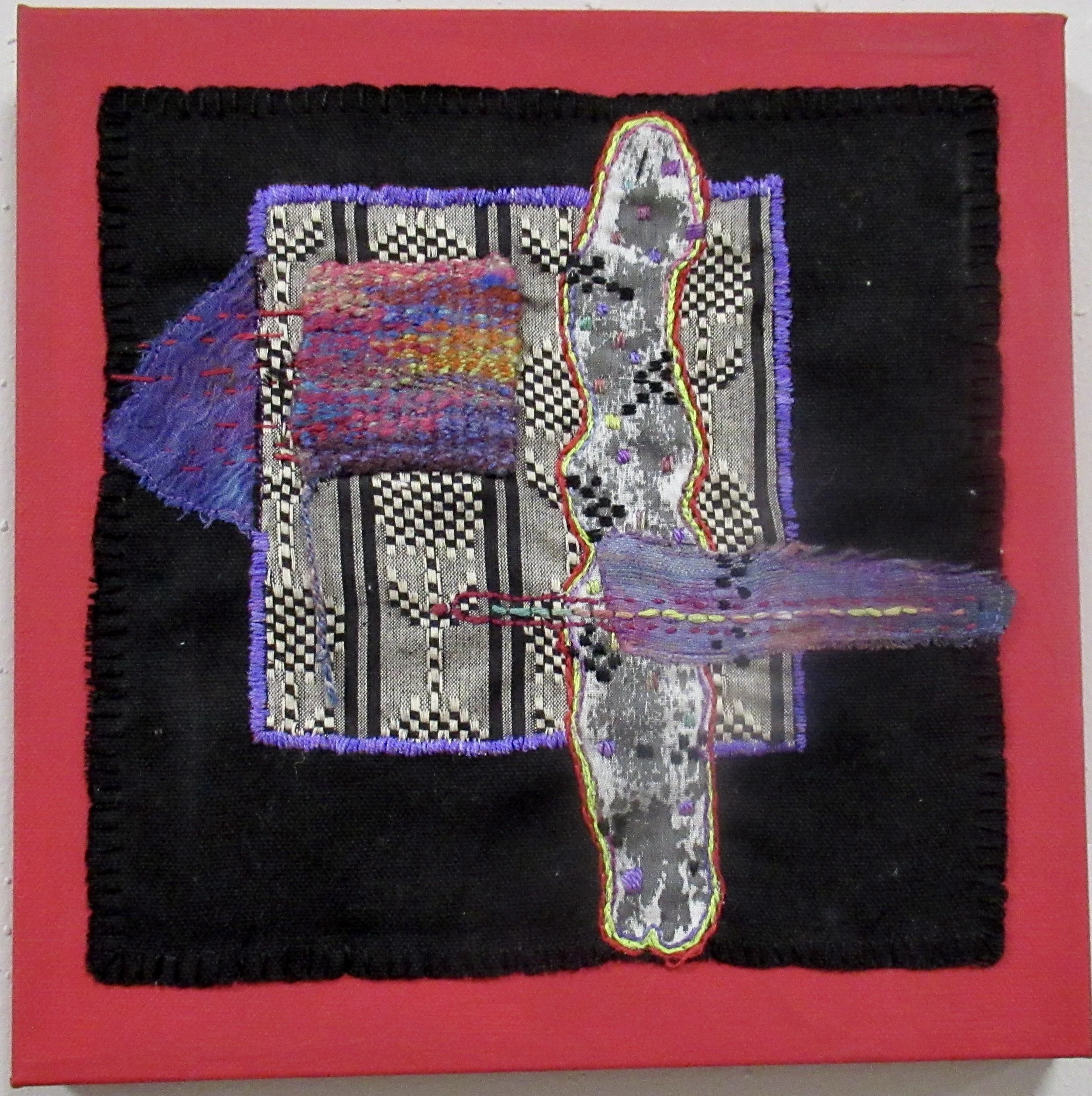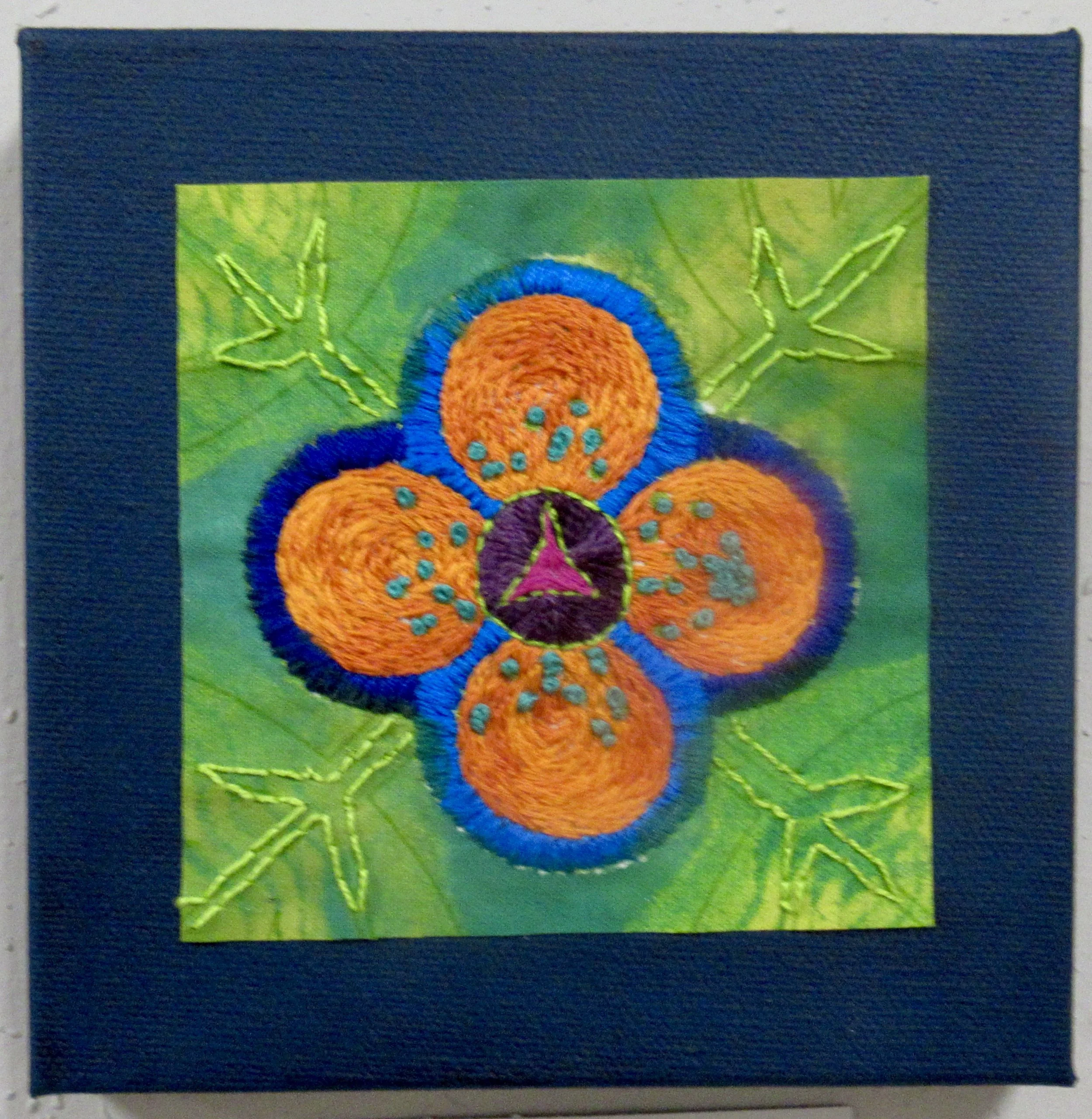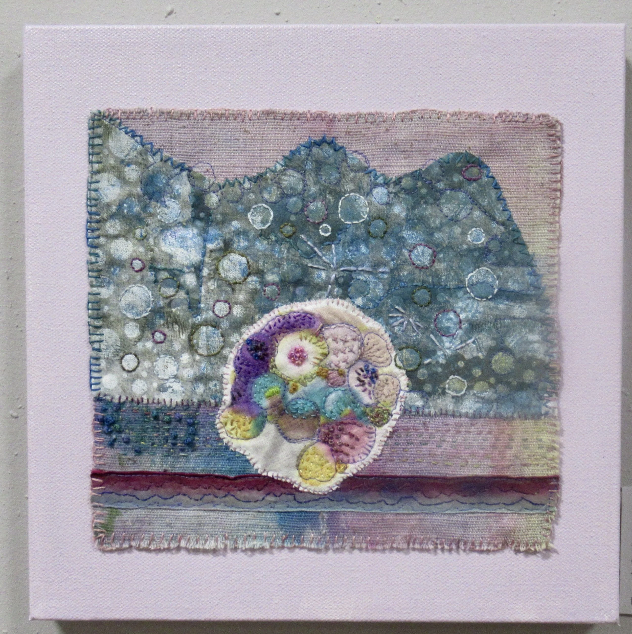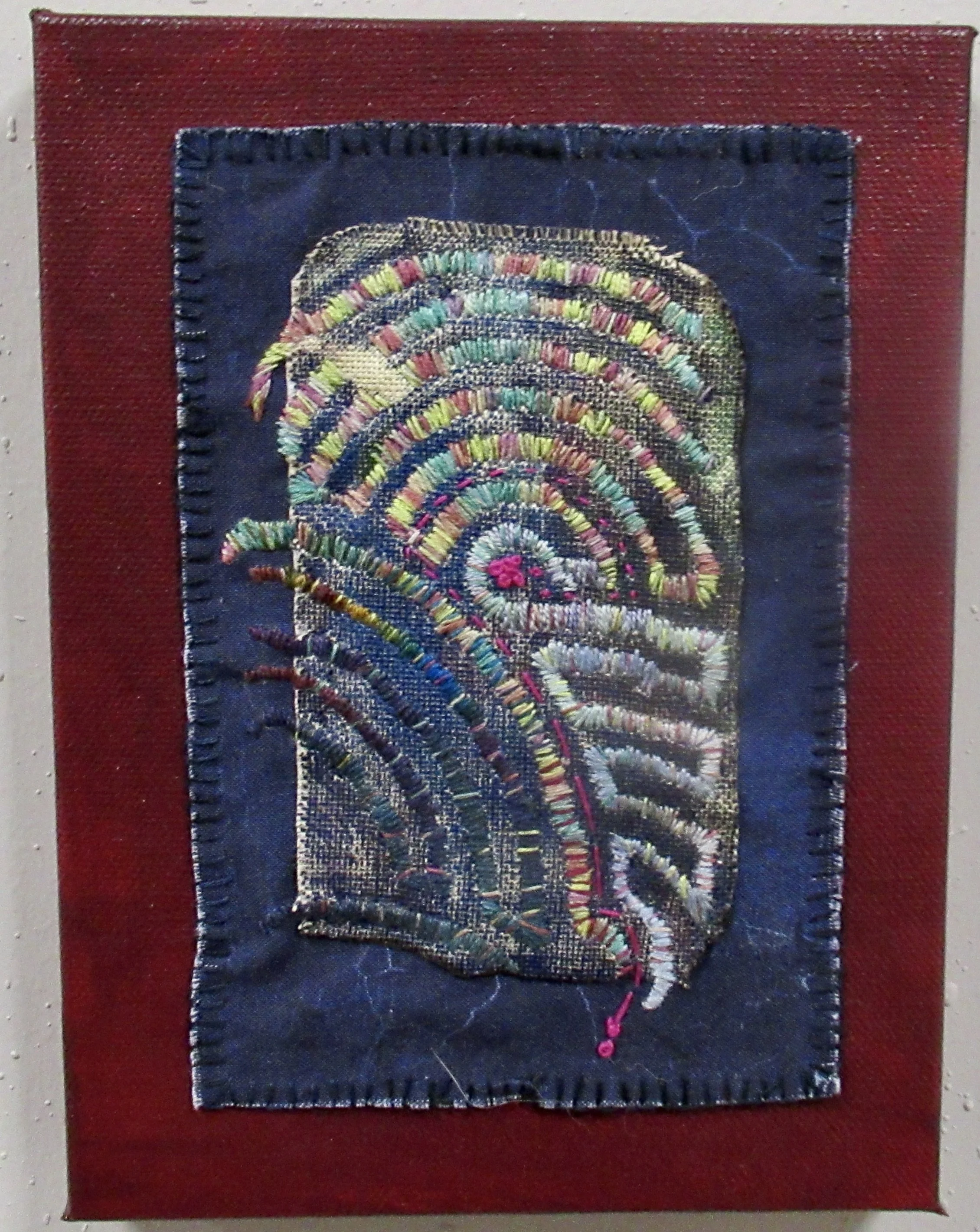It started out as a disciplined squares embroidery with squares in a line, but the squares had a mind of their own and this piece resulted.
