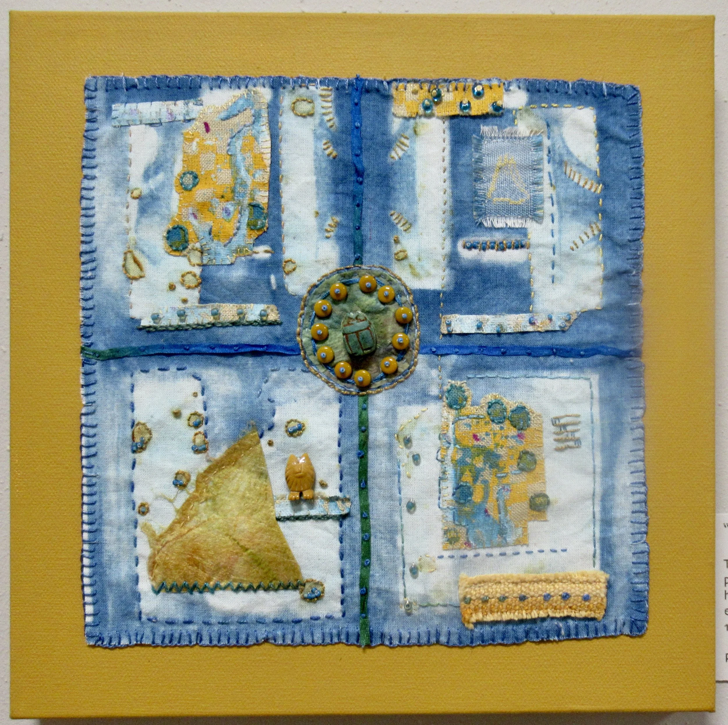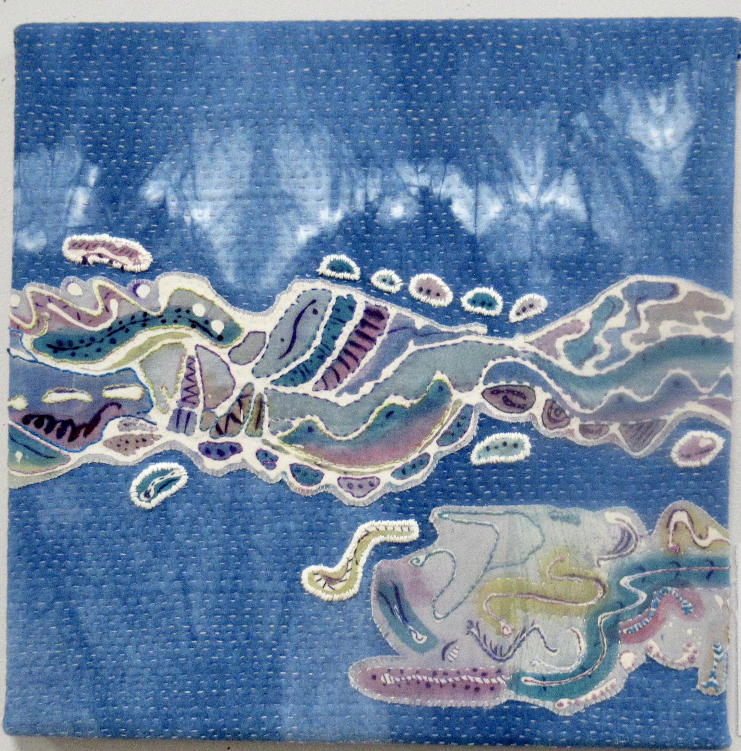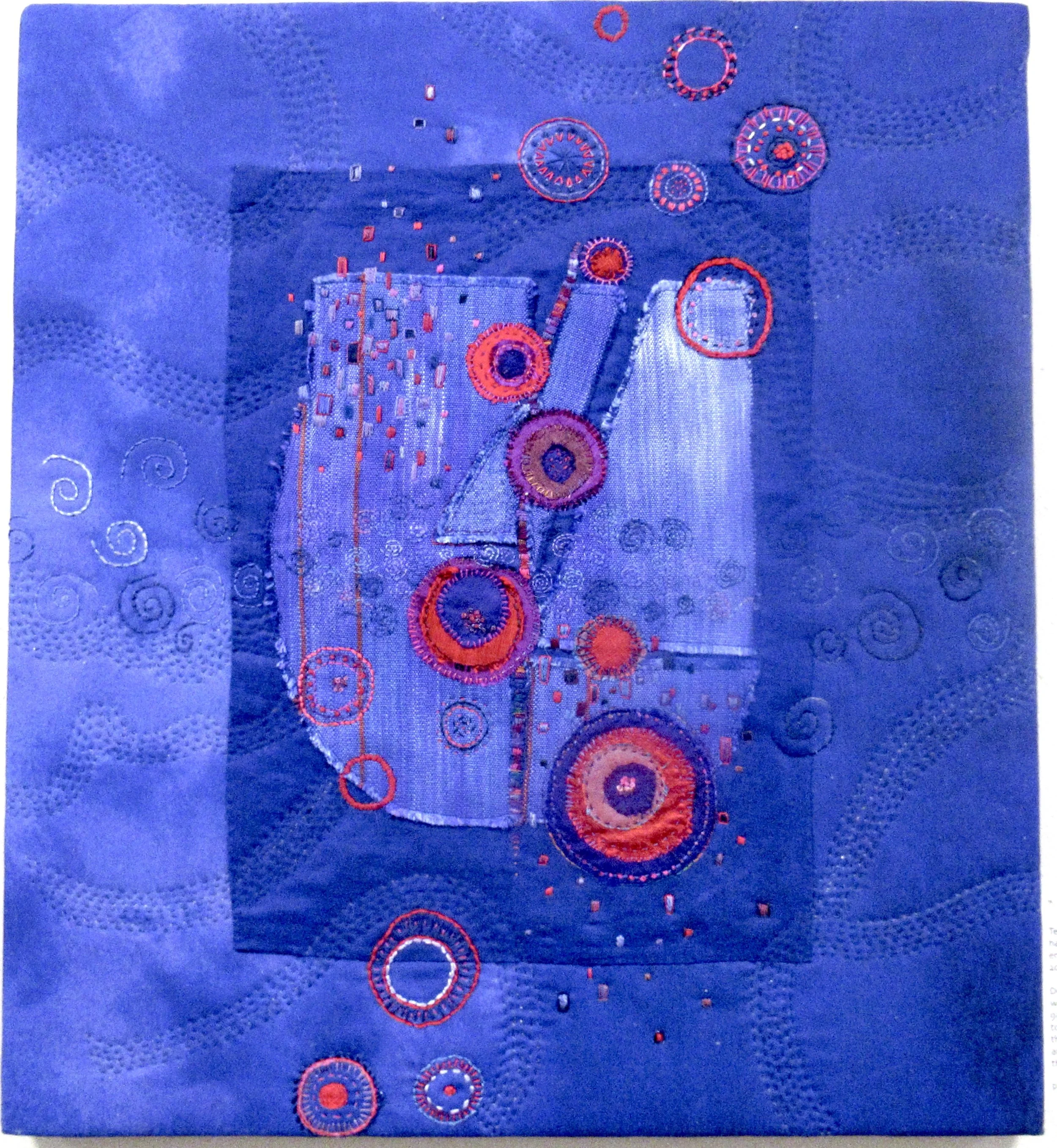 Inktense pencils on blue fabric, hand embroidery, machine quilting, silk paper