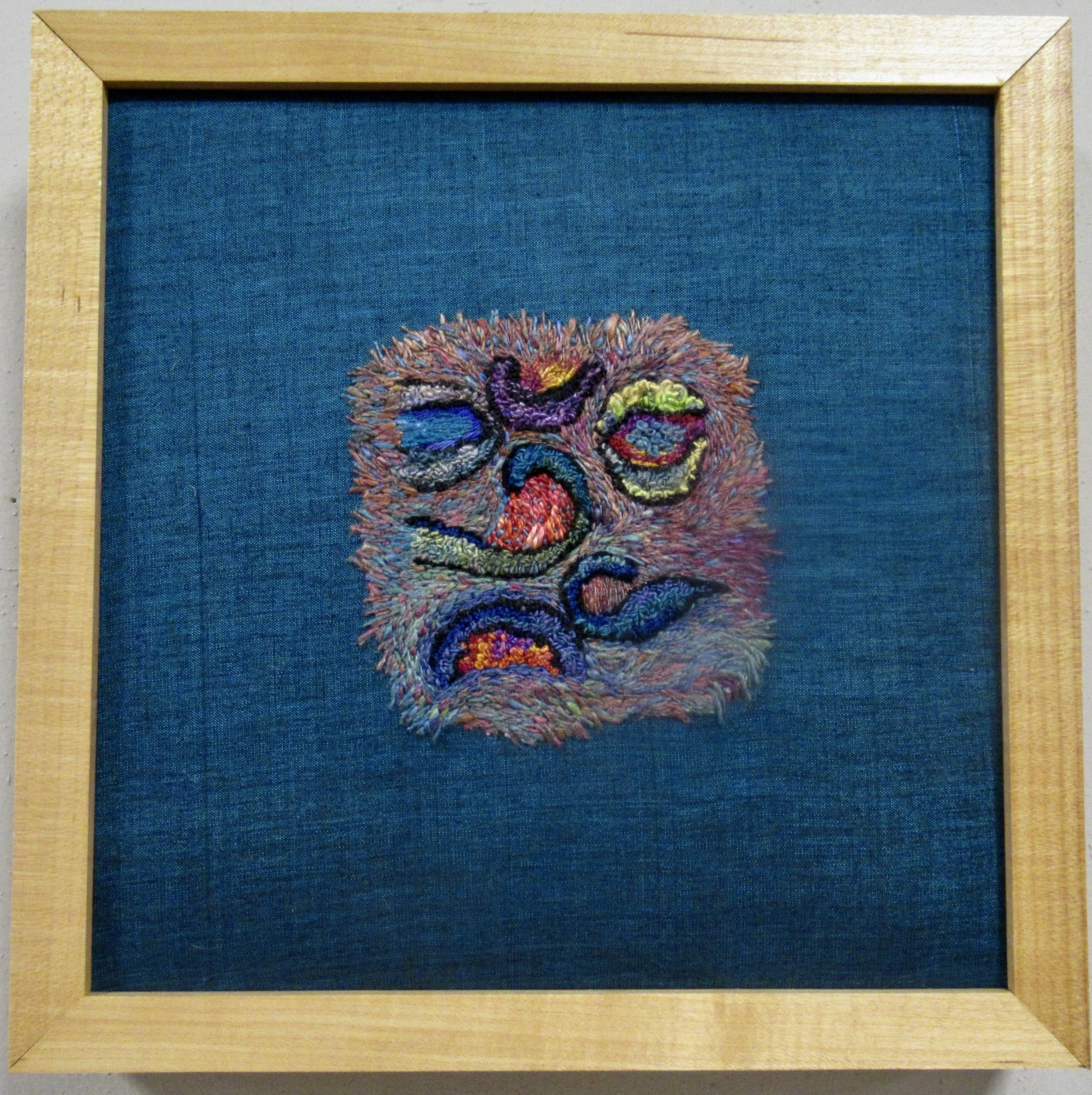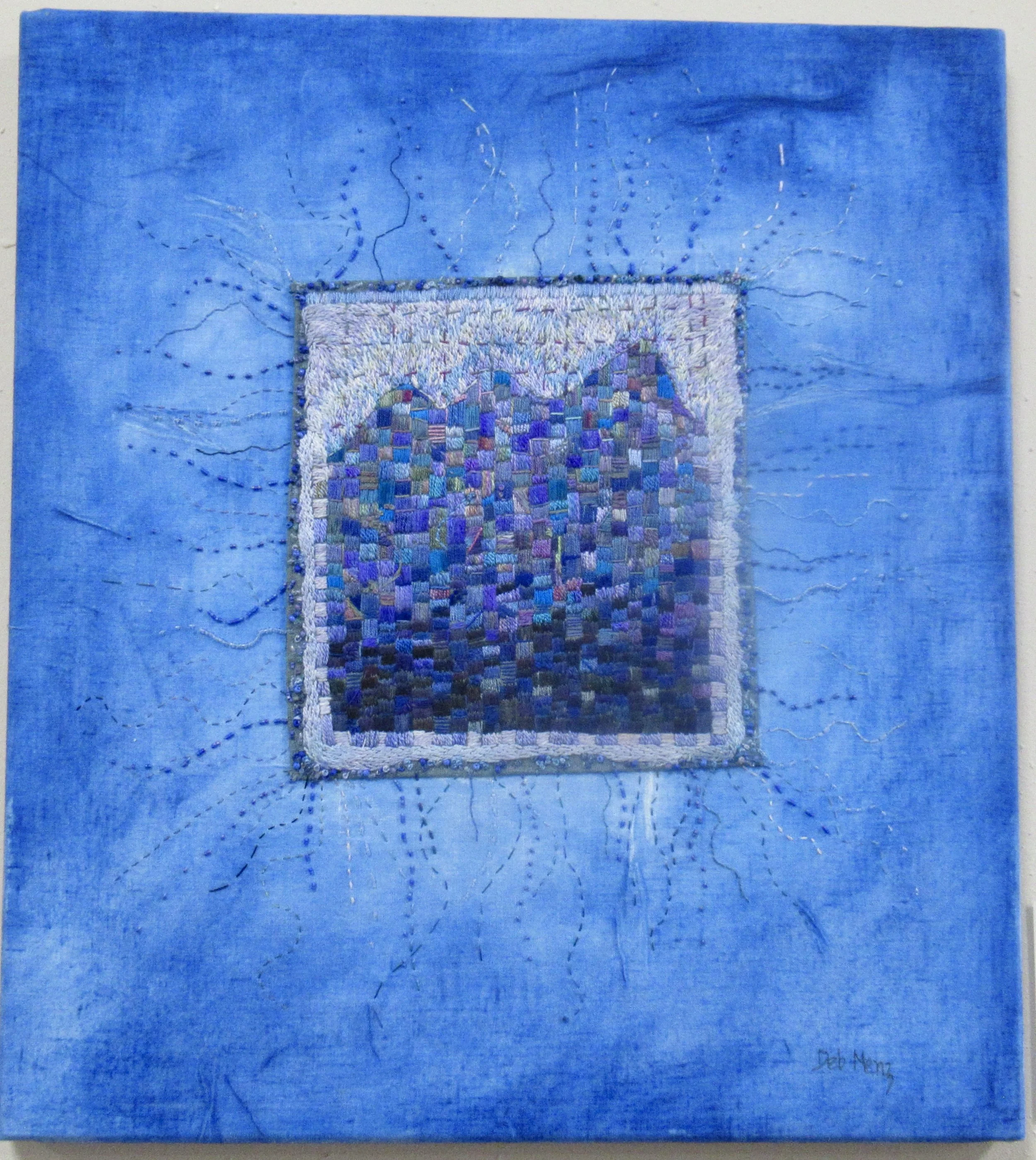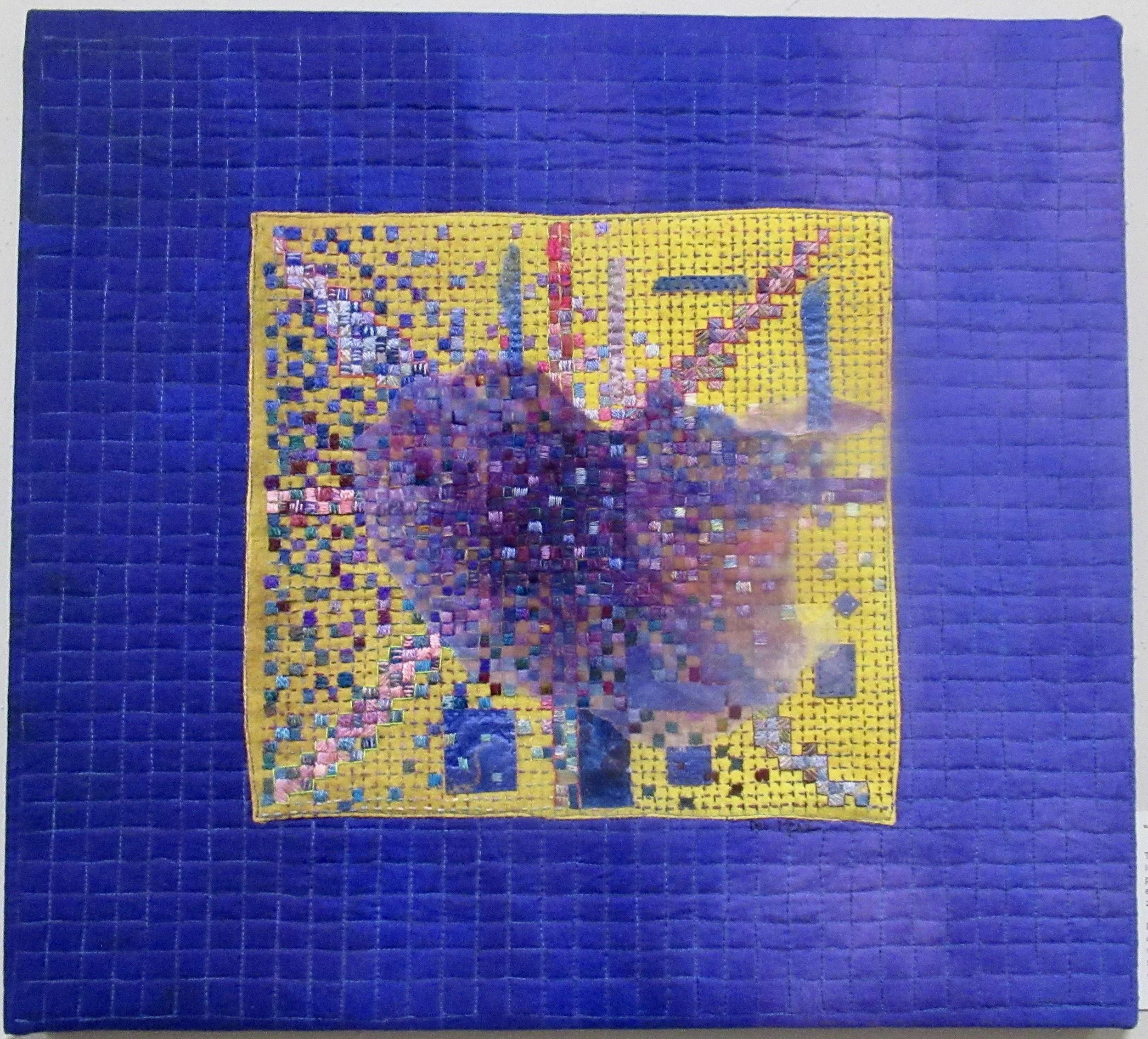 Inktense pencils on blue fabric, hand embroidery, machine quilting, silk paper