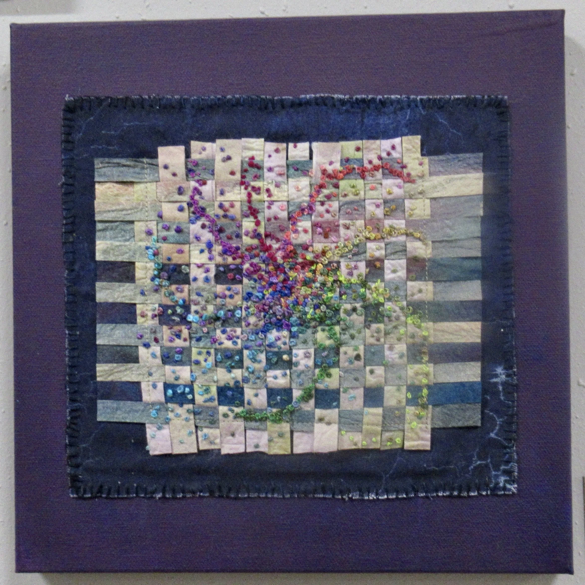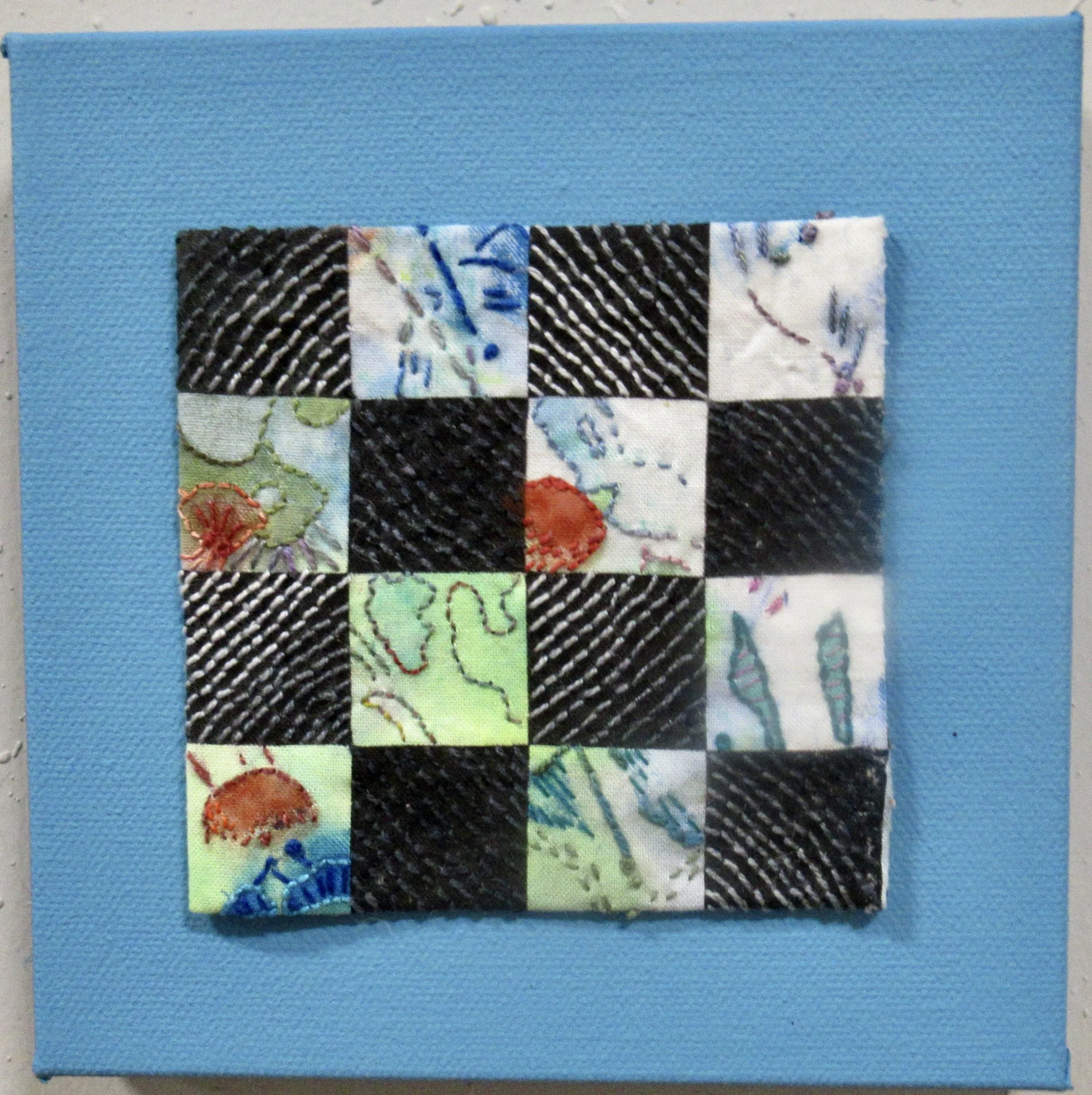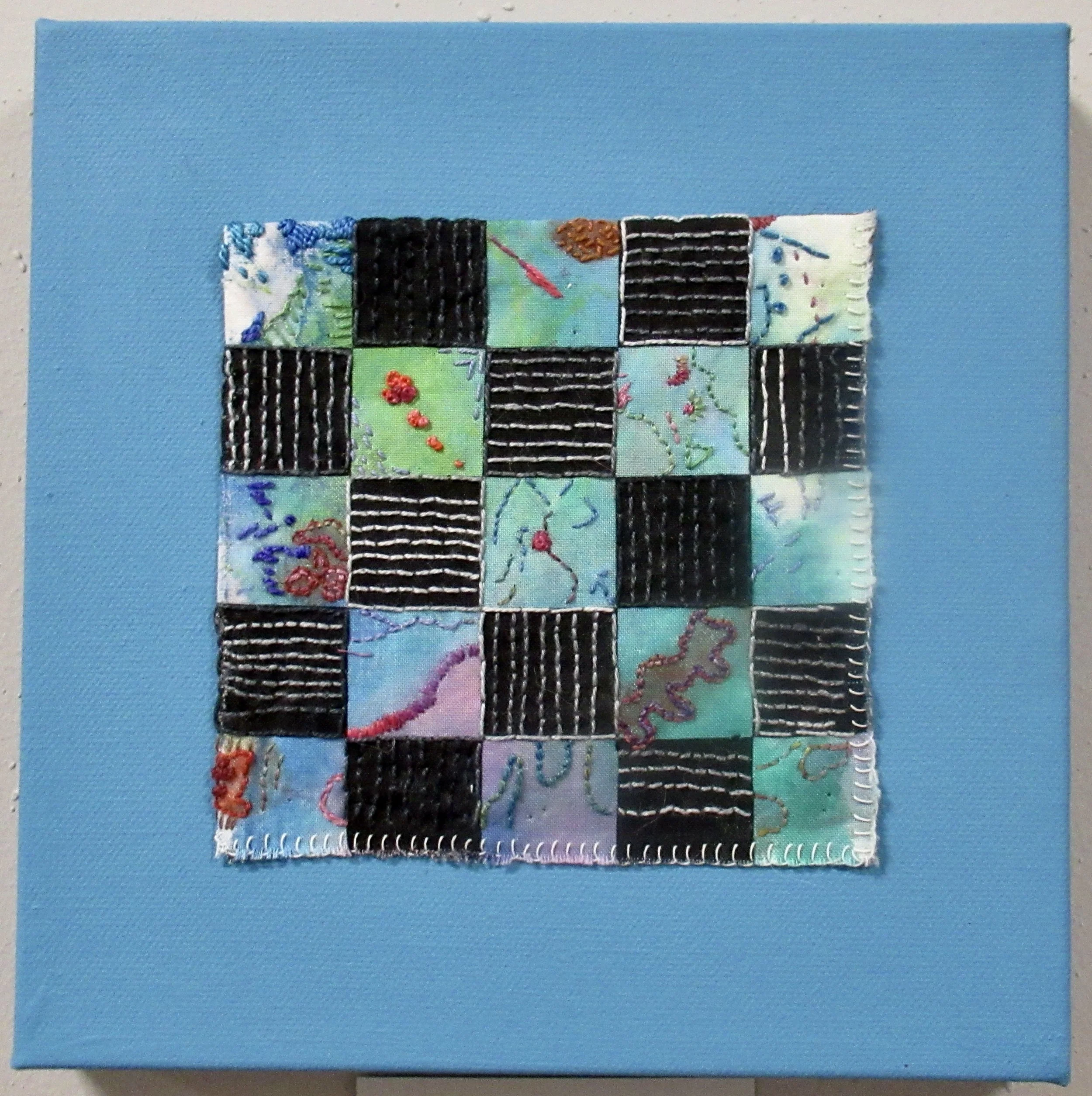 This is first in the series of squares. During a stressful time in my life, I began to stitch 1/4” squares using random colors to center myself and think.