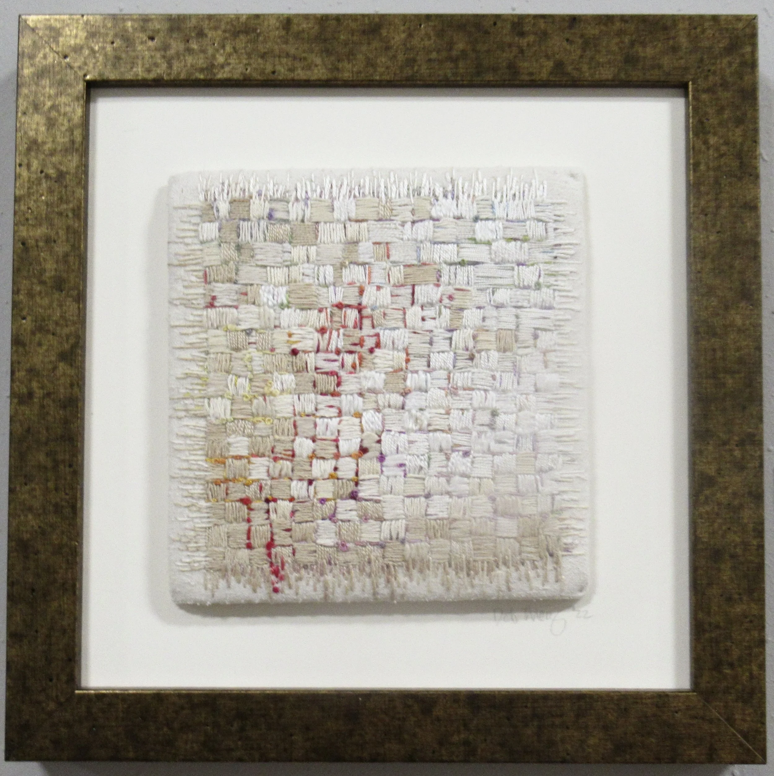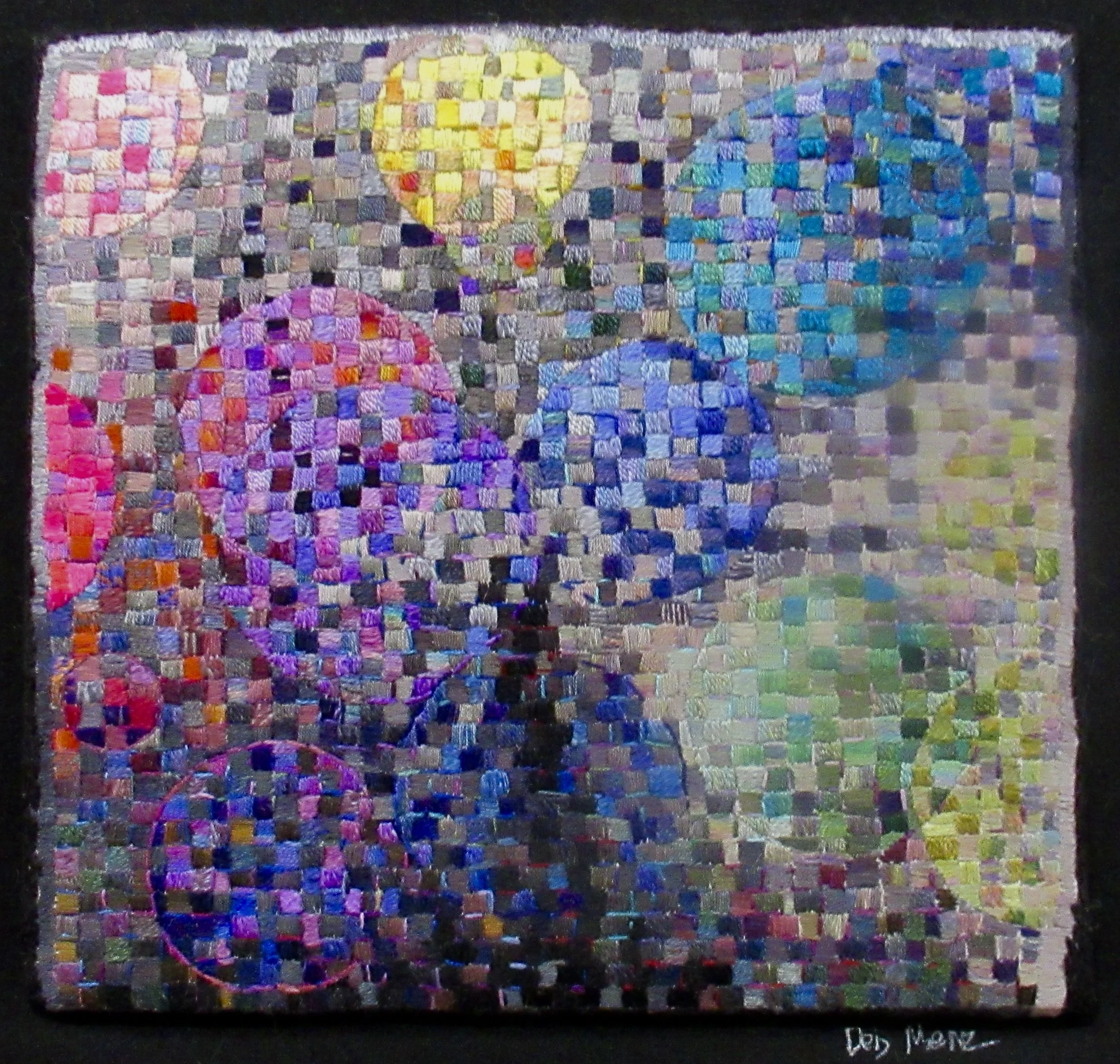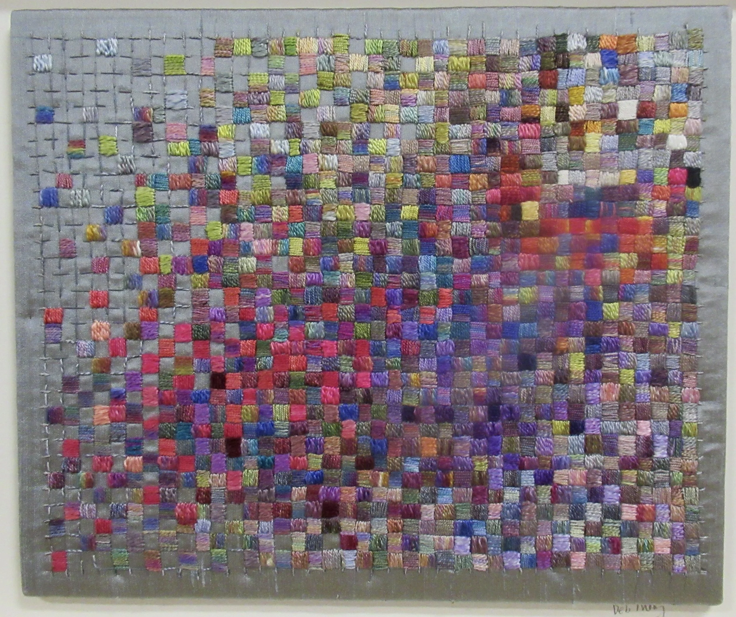 This is first in the series of squares. During a stressful time in my life, I began to stitch 1/4” squares using random colors to center myself and think.