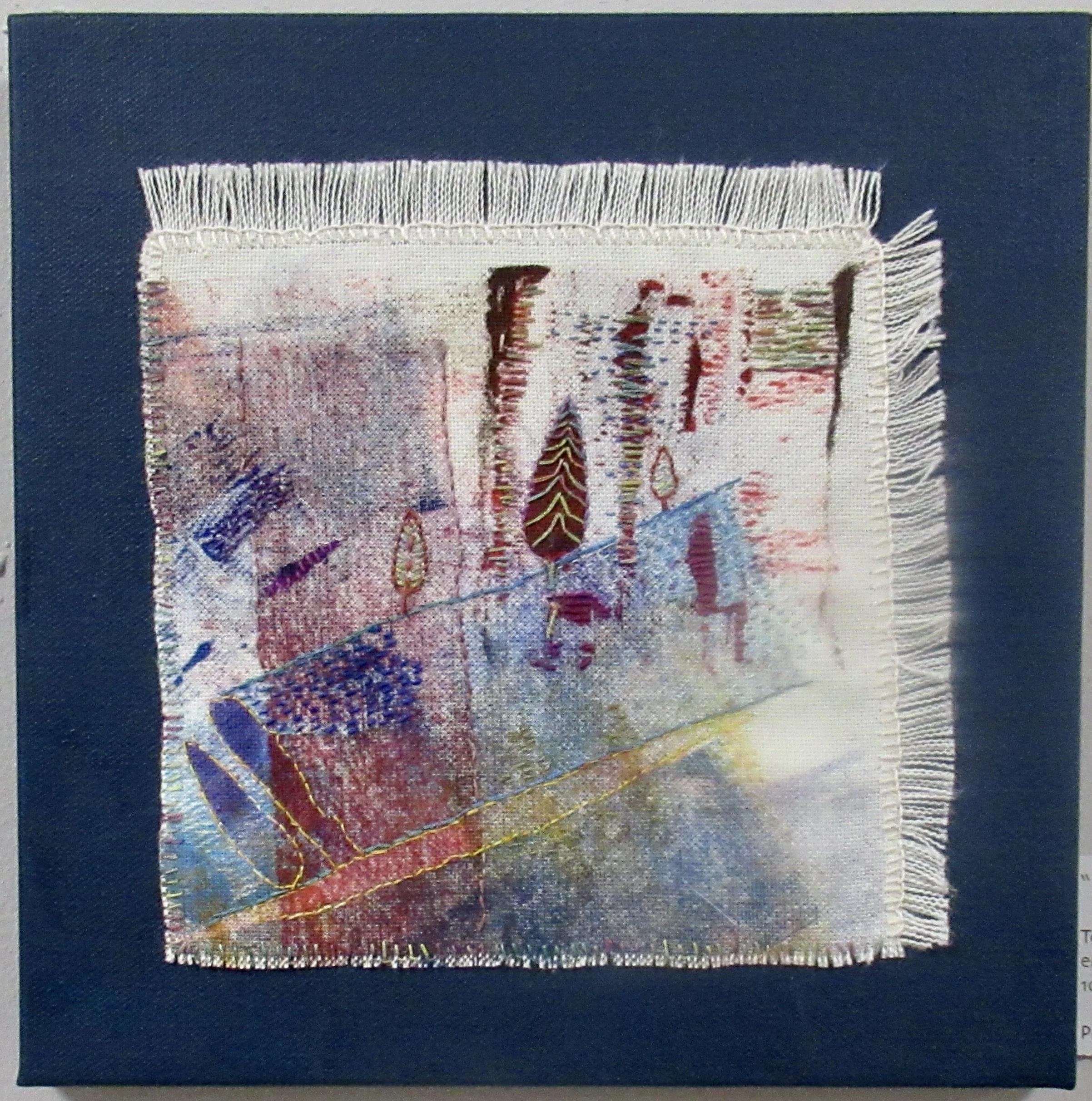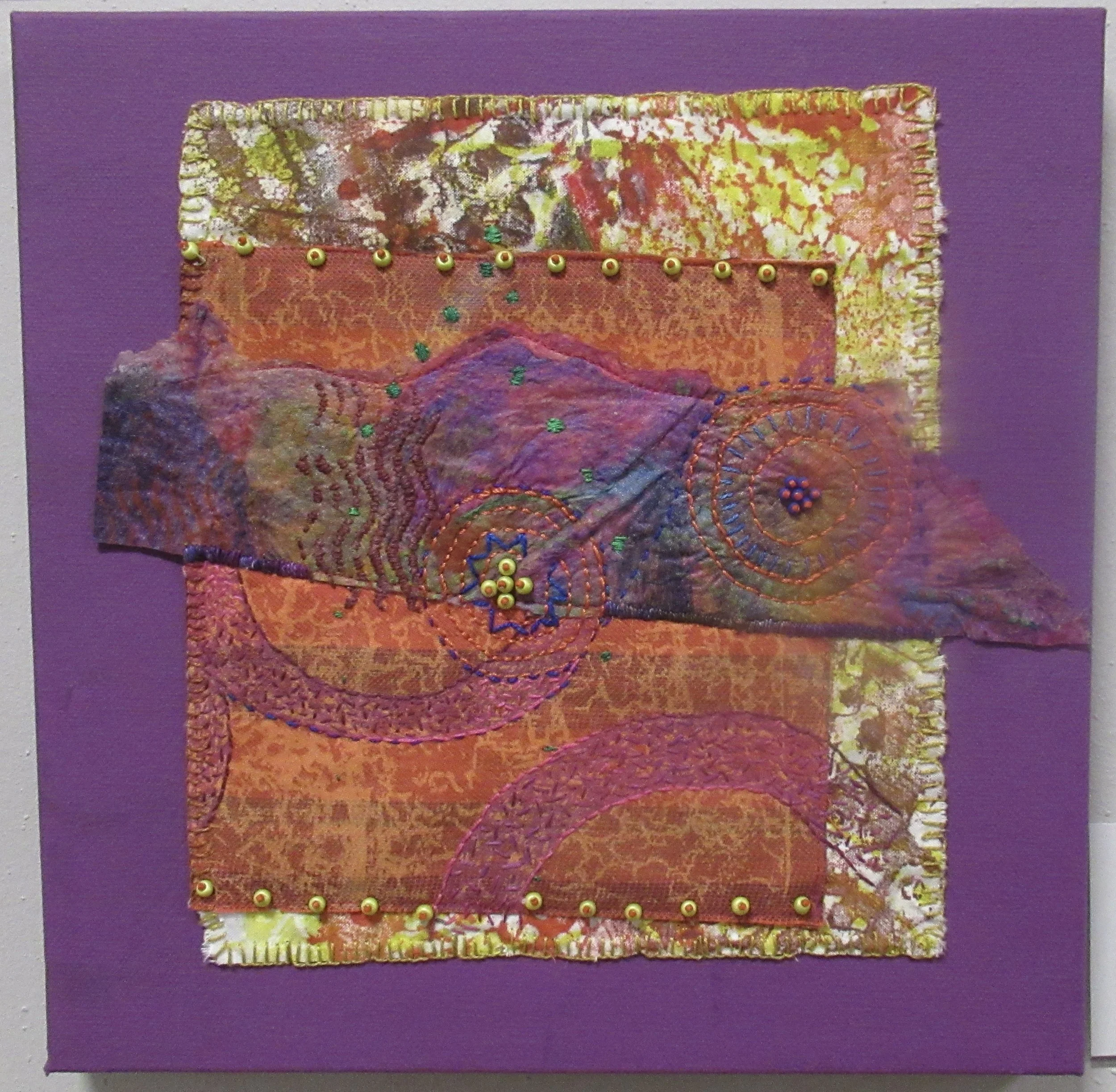 “Purple Rain” 6” x12”Mono printed fabric and hand embroidery