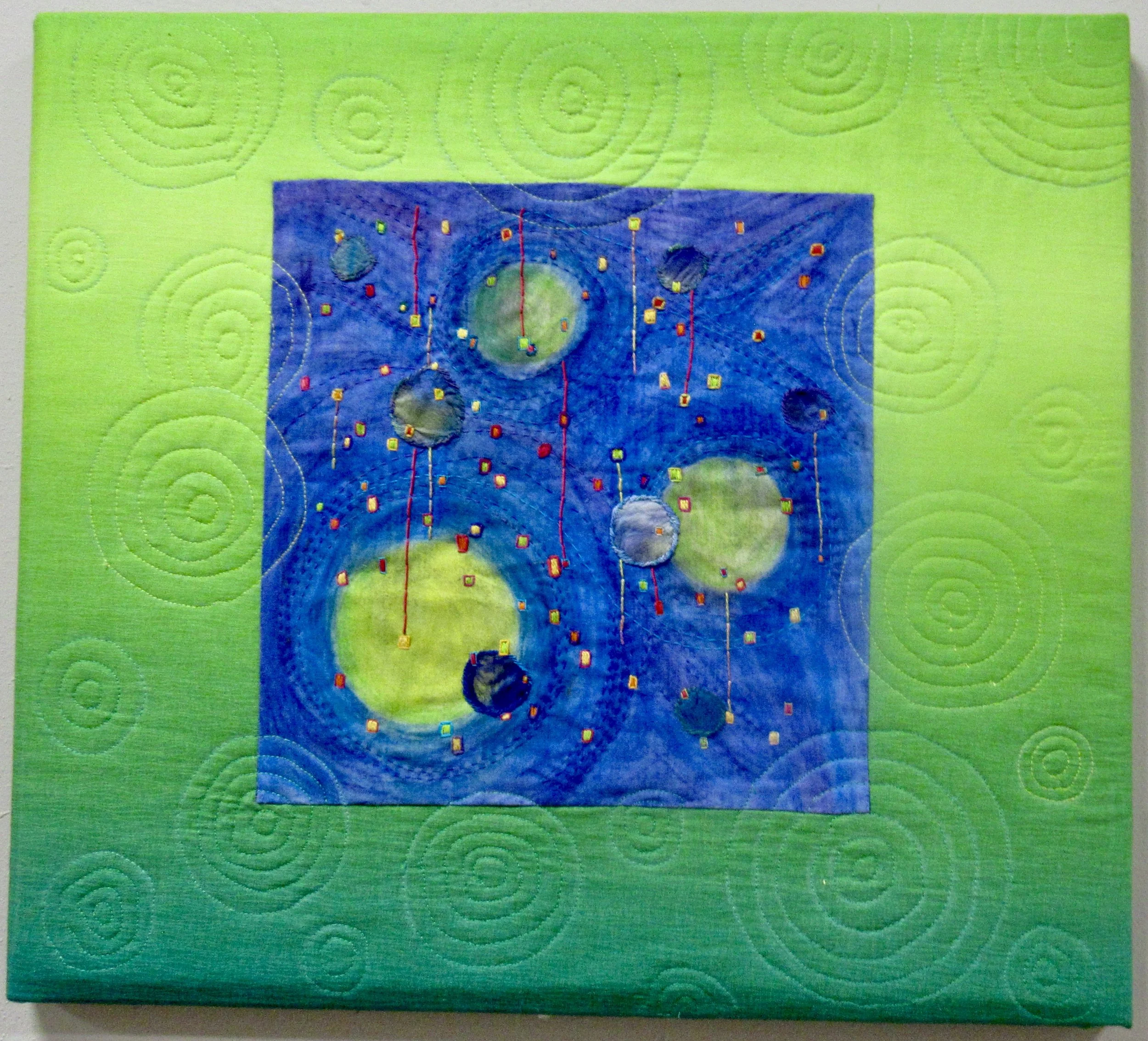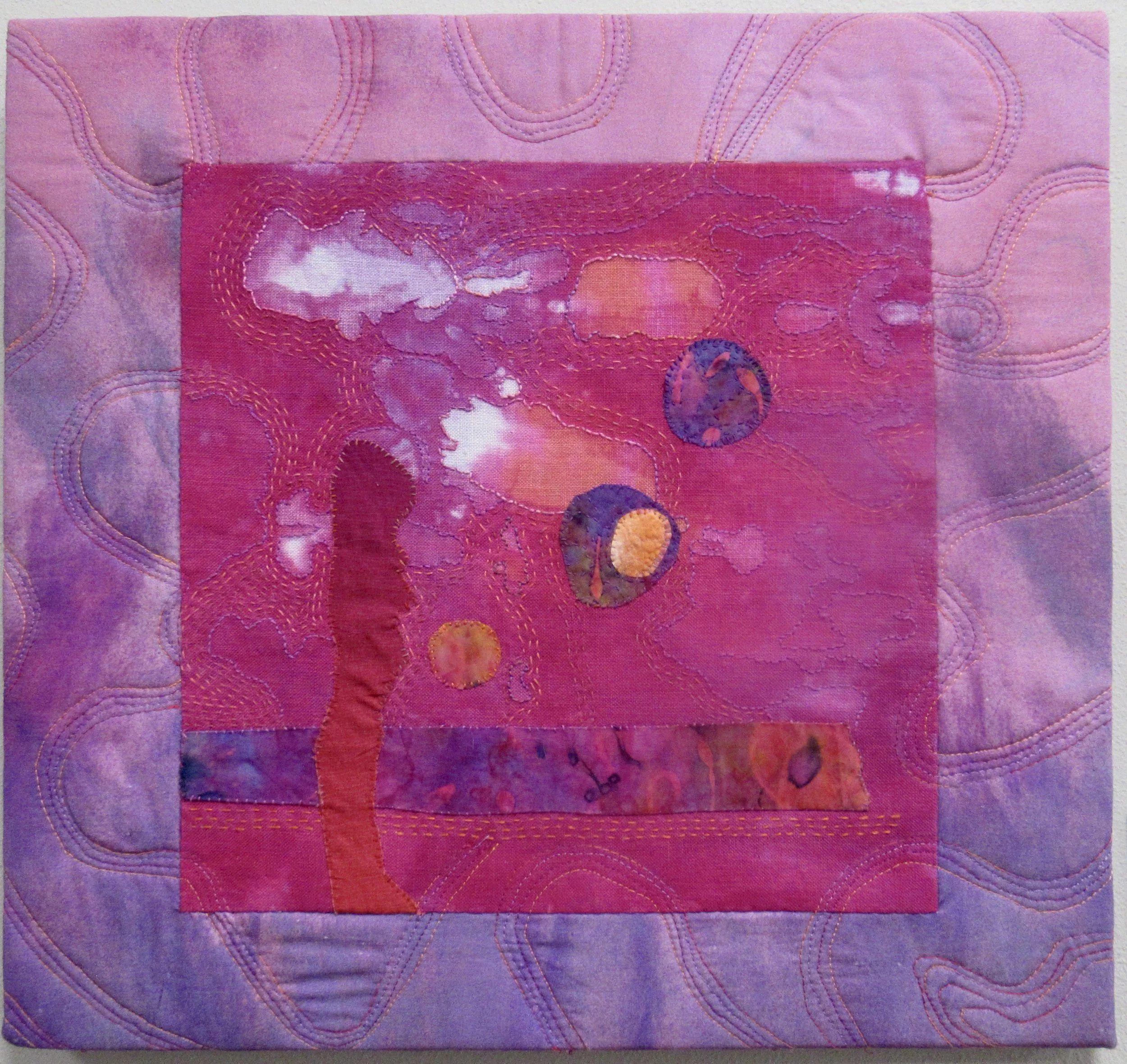 Dyed fabric, hand embroidery, machine quilting