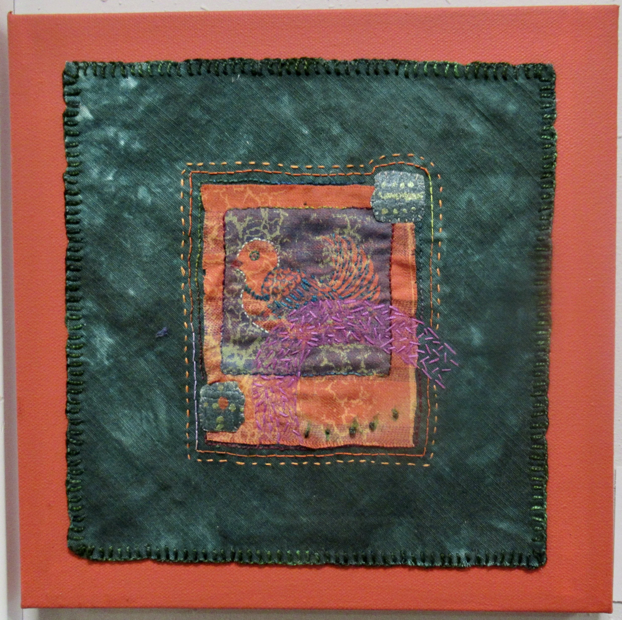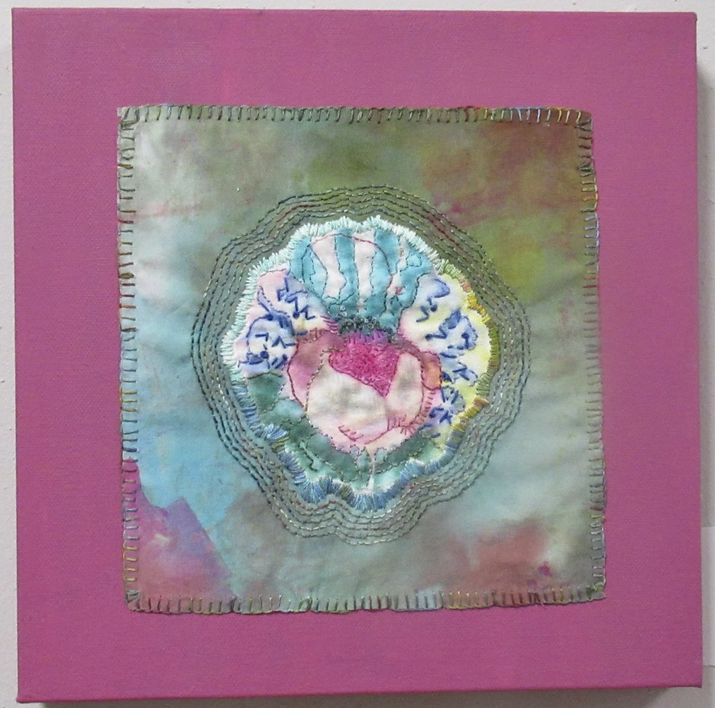 hand dyed threads, Inktense painted background, silk paper, machine quilting, hand embroidery